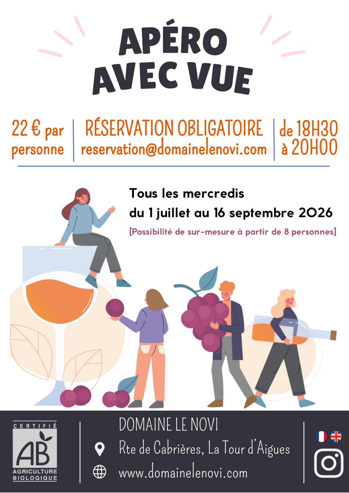 Si vous avez un projet de privatisation : anniversaire, groupe, séminaire, ... n'hésitez pas à nous en faire part à contact@domainelenovi.com